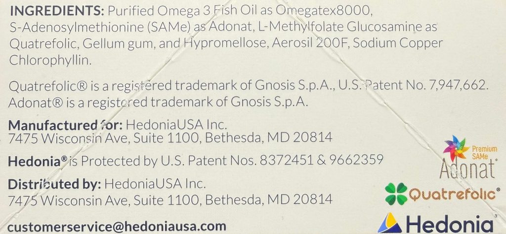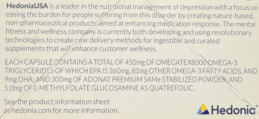 Each gel-capsule contains a total omega-3 triglyceride content of 640mg of which EPA is 400mg, 400mg of Adonat® Premium SAMe Stabilized PowdeR, and 3.75mg of Quatrefolic® ((6S)-5-methyltetrahydrofolic acid).